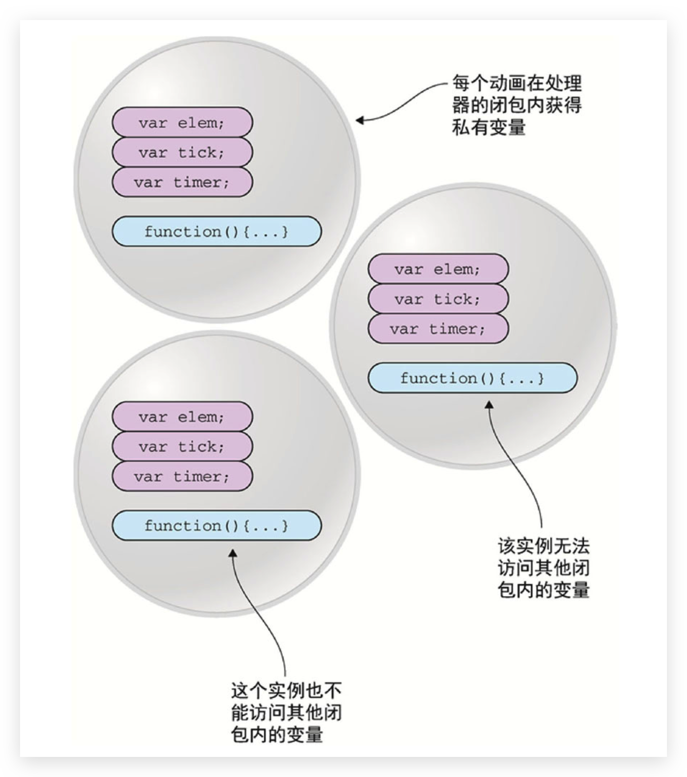 若将 animateIt 函数中三个变量移到全局作用域,也可以工作,但是会污染全局作用域,使用闭包,可以很好处理这事。特别是多个动画时,每次调用 animateIt 函数都会创建一个新的词法作用域,其中的变量等都是独立的。